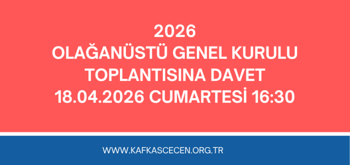 Kafkas Çeçen Kültür Derneği Yönetim kurulumuzun 30/03/2026 tarihinde yapılan toplantısında dernek olağanüstü genel kurulu yapılmasına karar verilmiştir. 18/04/2026 tarihinde saat 16:30da Namık Kemal Cad. Çakırağa cami aralığı sorguçcu sok öktem apt. no kat 2...